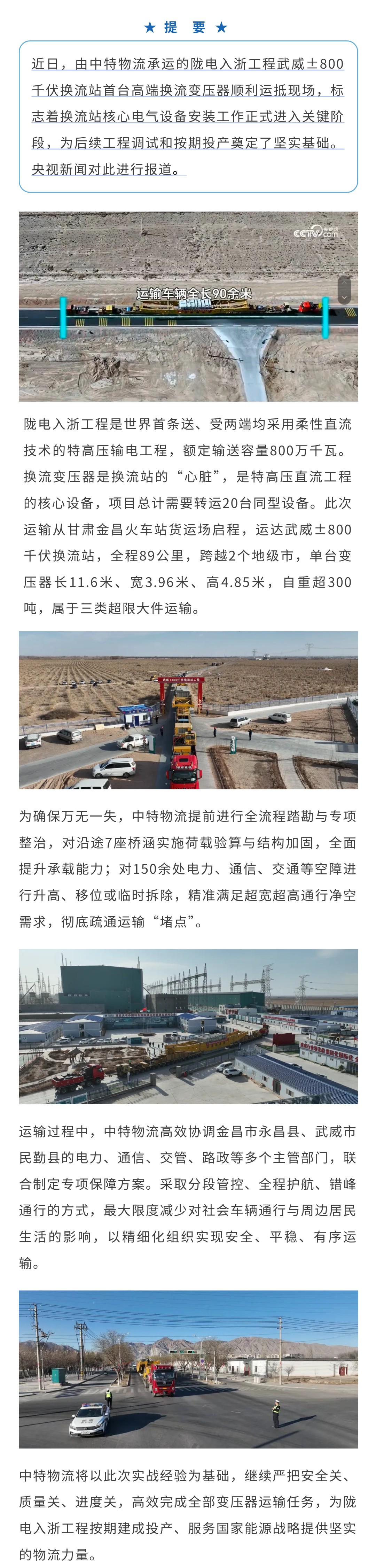 央视报道:陇电入浙工程首台换流变压器运抵甘肃武威